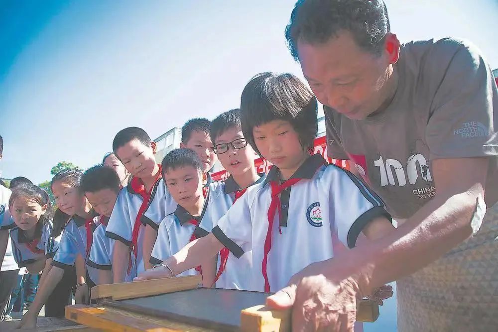 刘仰根(右)教小学生体验抄纸技艺。董观生 摄