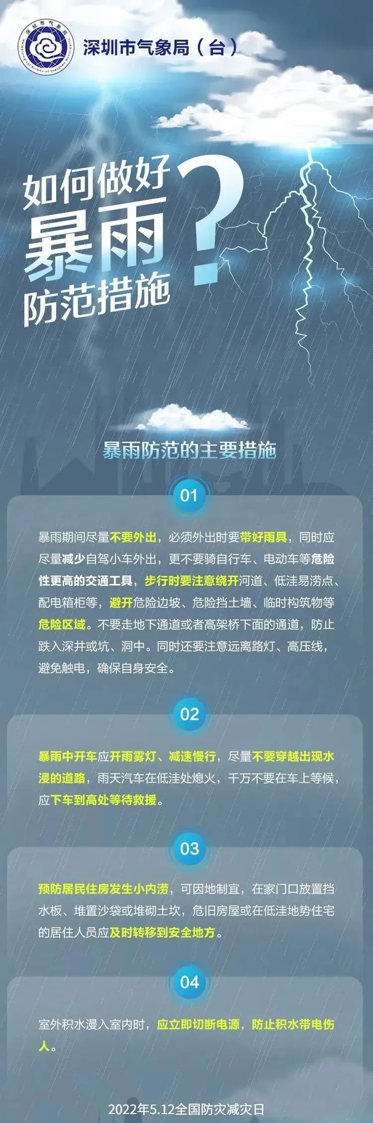 5月11日到15日,深圳市将出现今年以来最强的持续性暴雨过程,并可能伴有雷暴大风等强对流天气。