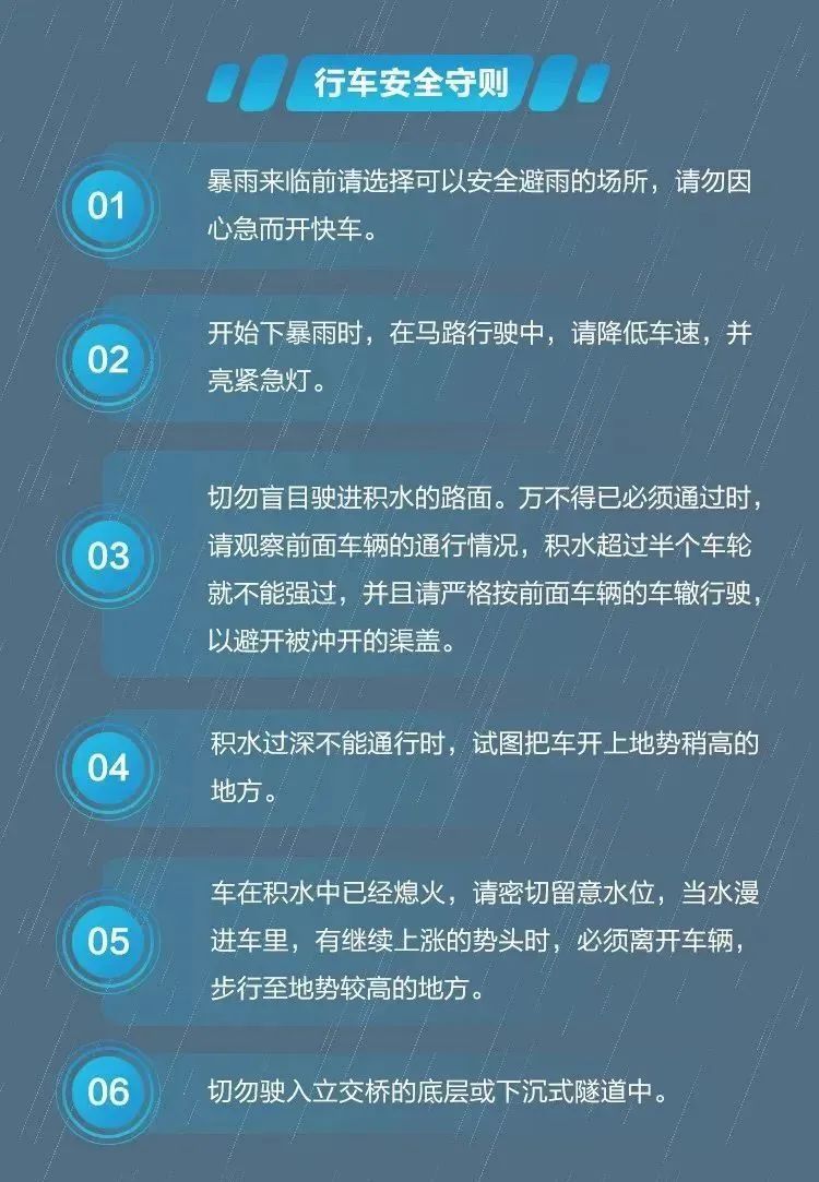 强降水时尽量减少外出,必须外出时,在雨中开车应开雨雾灯并留意积水点分布,尽量不要穿越出行水浸道路,如遇积水深浅不明尽量绕行。