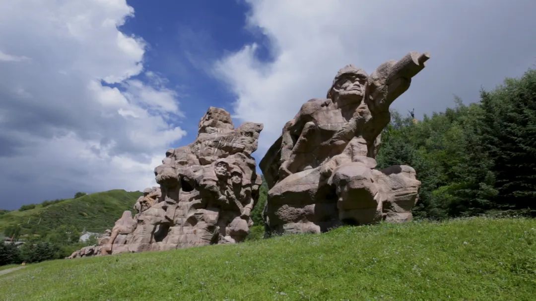 依元宝山西麓坝上建成的巨大群雕高10多米,长90多米,由告别苏区、艰苦历程、黎明火种、火炬碑文、山间小憩、开路先锋、勇往直前、团结北上、草地情深、征途葬礼、前赴后继、回顾思考、英灵会聚等组成,是用1300多块大型花岗石精雕细錾而成,被誉为我国目前最大的现代群雕。