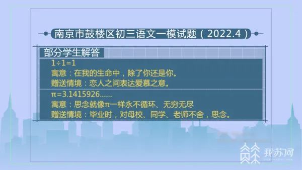 有学生解答,1÷1=1,寓意“在我的生命中,除了你还是你”,赠送情境是“恋人之间表达爱慕之意”。还有学生解答,π=3.1415926……,寓意“思念就像π一样永不循环、无穷无尽”,赠送情境为“毕业时,对母校、同学、老师不舍,思念”。