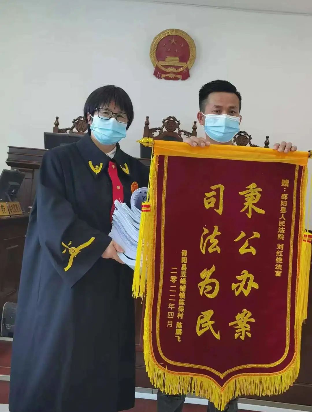 4月8日,上午11点50分,邵阳县法院第六审判庭休庭法锤刚敲响,“感谢刘法官,公平公正审判案件,感谢刘法官,为我要回了血汗钱,感谢刘法官,让我相信法律是为老百姓做主的”的话语声响彻了整个审判庭,一名男子边说边举着锦旗朝审判席走去。