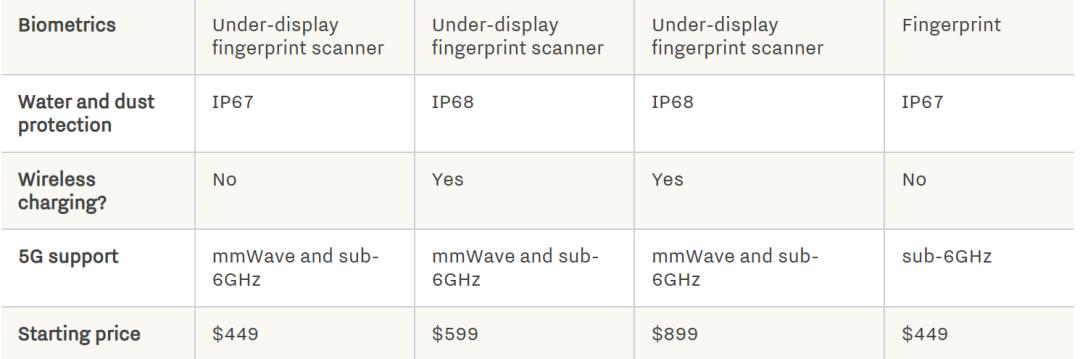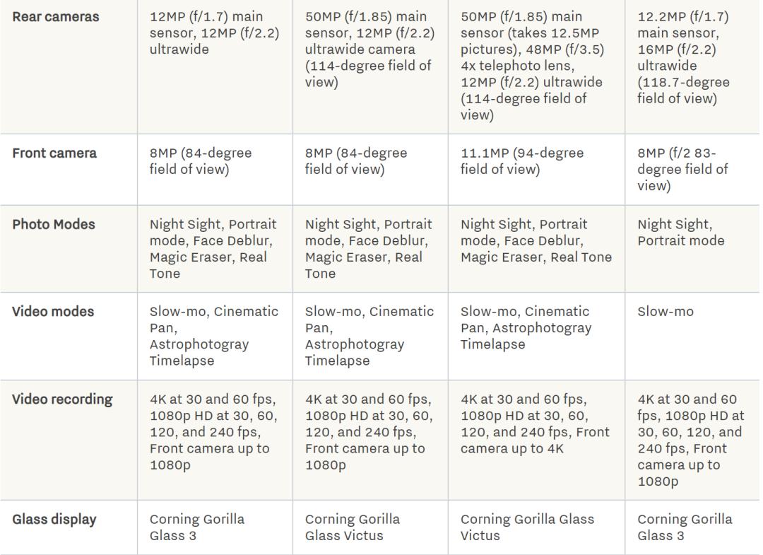 Google Pixel 6A、Google Pixel 6、Google Pixel 6 Pro和Google Pixel 5A的对比如下图所示: