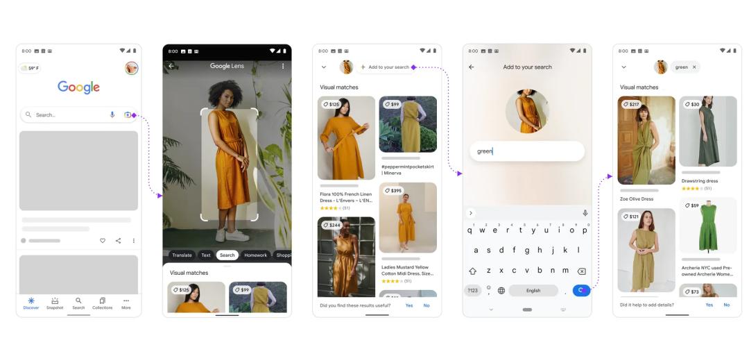 最明显的成果是Multisearch。使用谷歌应用程序,用户可以拍摄一件连衣裙的照片,然后输入“green”细化自己的偏好,这是在文本框中无法做到的事情。