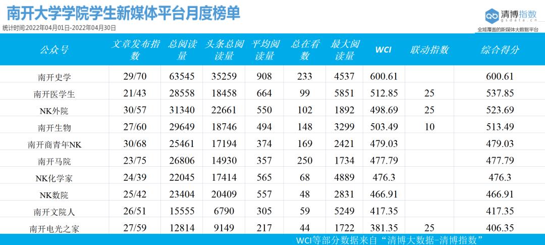 为促进南开大学各院系学生微信公众平台的交流共进,从2018年5月开始,南开大学团委网络新媒体运营中心对各院系学生微信公众平台的影响力和联动情况进行综合排行,制定榜单。