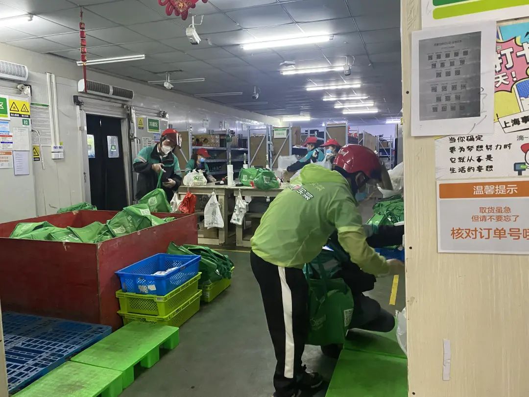 记者随后来到叮咚买菜宝龙站点,站内所有工作人员都忙碌地穿梭在各个区域。4位分拣员一刻不停地根据订单取货、分门别类装袋,再将一袋袋货物放置到取货架。