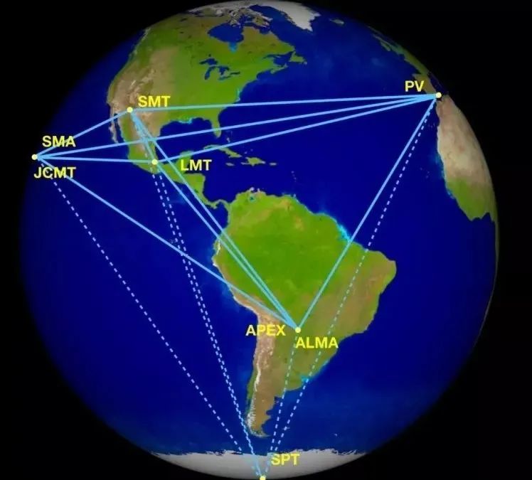 2017年4月份参加EHT观测的8个VLBI台站,实线连接的为观测M87的5个地点(7个台站;由于位置限制,位于南极的SPT望远镜无法观测到M87),虚线连接的为观测一个校准源(3C279)的台站。| 上海天文台