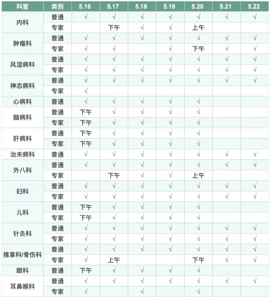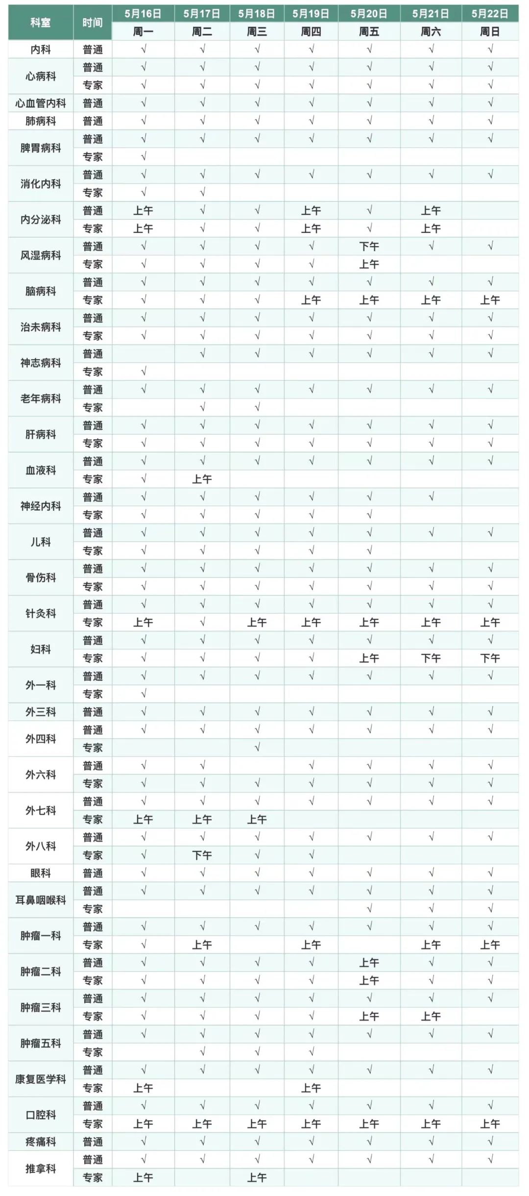 为确保人民群众的就医需求,上海市中医医院全面开放普通门诊、专家门诊。下周起包含上海市中医药学会分会主委等专家在内的30名主任医师开设特需门诊。医院特别设置社区志愿者代配药挂号、付费、取药专窗。芷江路院区急诊、发热门诊、核酸采样点24小时开放。互联网医院问诊、复诊全面开放,同时提供5区(静安、黄浦、虹口、宝山、普陀)的中药饮片、西成药的快递配送,配送范围动态调整,敬请实时关注互联网医院网上通知。现将5月16日至5月22日门诊安排公布如下: