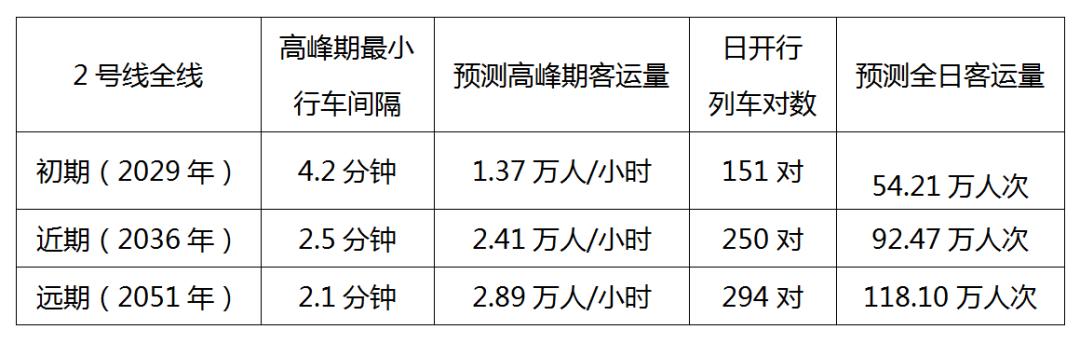工可报告提出,2号线运行时间为6:00—24:00,全天运营18小时。根据2号线分时段客流分布,初期、近期、远期计划日开行151对、250对、294对列车。高峰期最小行车间隔4.2分钟、2.5分钟、2.1分钟,平峰期最大行车间隔4.2~8.5分钟。