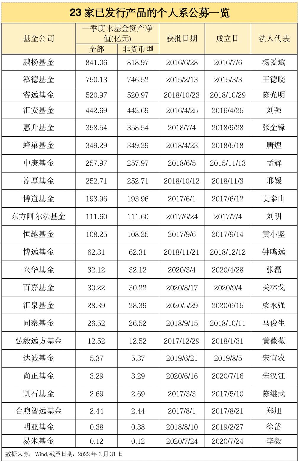 Wind数据显示,截至2022年一季度末,个人系公募基金管理的非货规模超过4000亿元,仅次于银行系、信托系和券商系基金公司,成为推动公募基金发展的重要力量。
