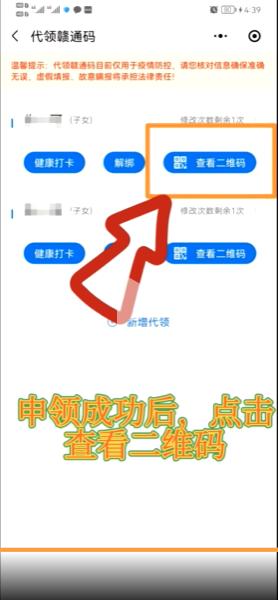 支付宝/微信打开赣通码——点击“代领赣通码”——点击“新增代领”——点击“同意”——正确输入代领人的身份信息——正确输入代领人的基本信息——申领成功后,点击“查看二维码”——老人/小孩的赣通码—截屏保存/打印,老人孩子可以使用自己的赣通码啦~