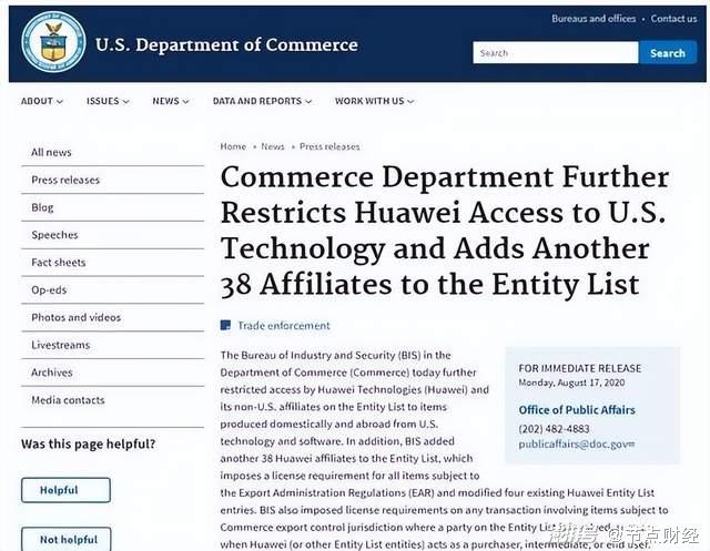 华为子公司被列入美国“实体清单”(美国商务部网站截图)