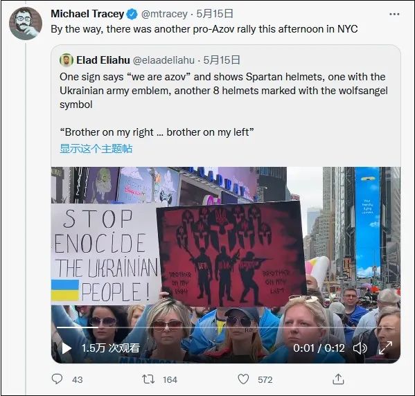 值得一提的是,特雷西还分享了一个视频,15日下午,纽约市的一场支持乌克兰游行中,不少美国人明确举牌,支持亚速营。