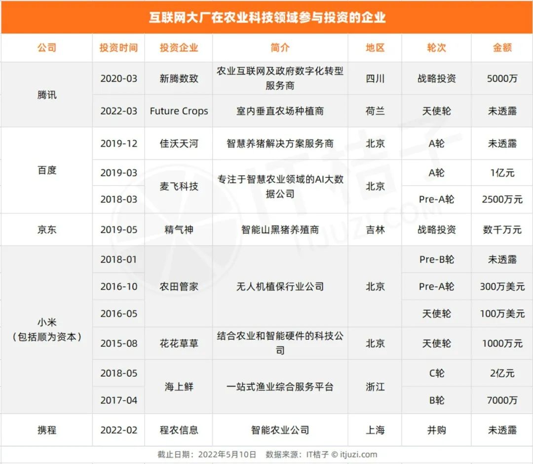 农业科技市场投资的火热,吸引的不止是顶级投资机构,闻声而动的还有国内互联网大厂们,包括阿里、腾讯、百度、小米、京东、携程等都在进行布局。