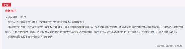 本科高校的设置(包括更名大学)审批权在教育部,属于国家和省的重大事项,按照教育部有关要求,由省政府研究并依程序报教育部审批,且须先纳入高校设置规划,并有严格的条件要求。目前没有收到合肥师范学院更名大学的意向和申请。我厅工作人员于2022年4月14日对留言人进行电话回访,并获得留言人认可。