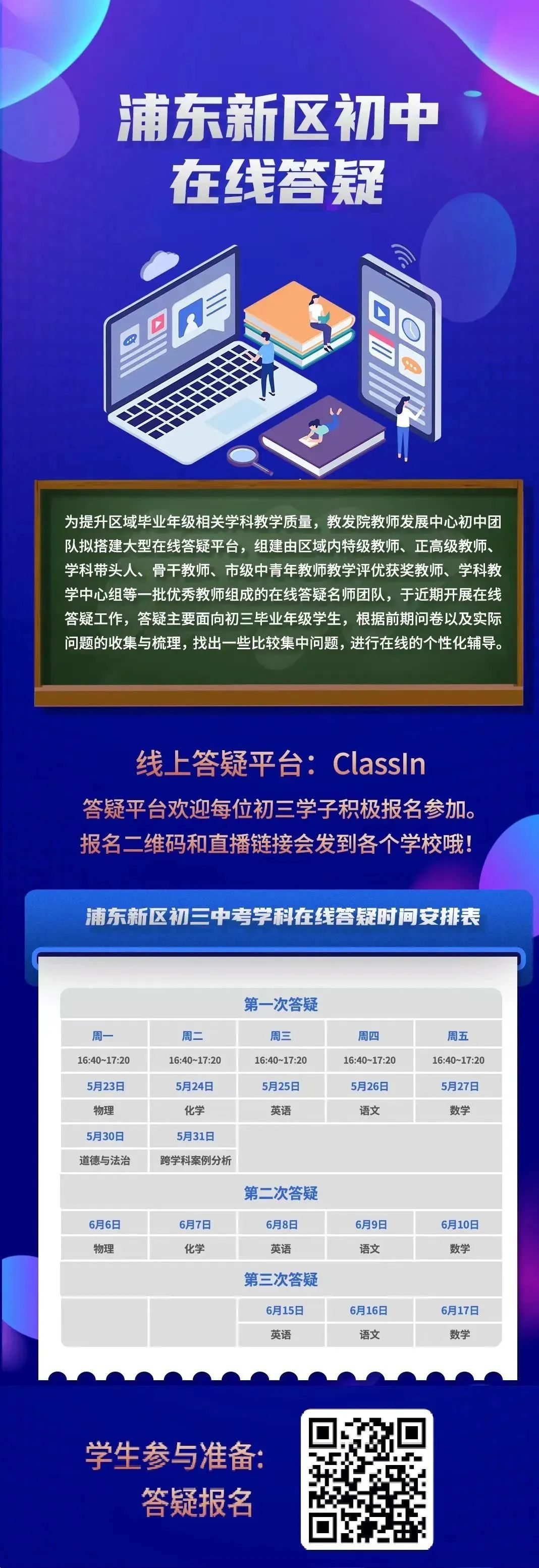 “中考延期,我们将一路陪伴各位同学、家长和老师,一同迎接挑战!”教发院教师发展中心副主任徐颖介绍,中考科目的相关提问搜集工作已经展开。浦东初三毕业生学习中遇到的疑难问题,可以向自己的相关学科教师反映,扫一扫老师提供的二维码,分学科提交自己的困惑。针对初三学生提出的比较集中和核心的问题,浦东名师将精心准备、在线解答,有的放矢开展个性化辅导,同时也欢迎学生进入ClassIn平台现场提问。