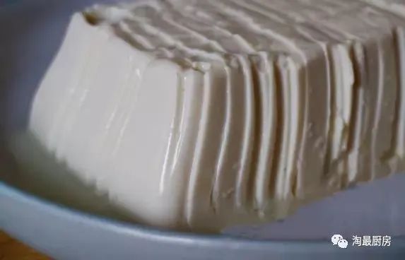 1. 将绢豆腐切成2cm小块,把水烧开后,放进豆腐焯水,用勺背轻轻朝外推,如图 ▽
