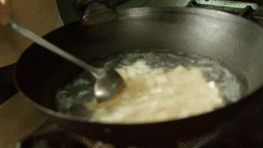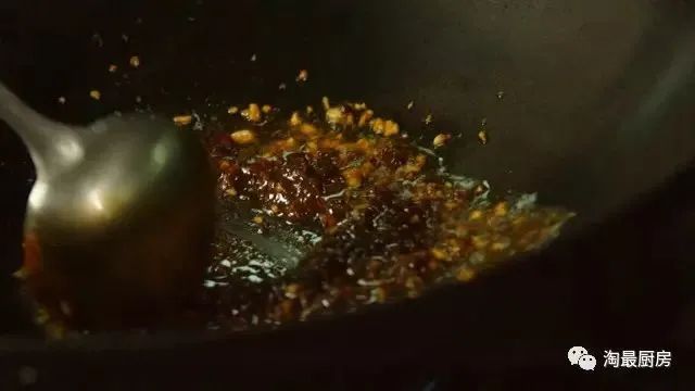 下油锅,放牛肉、豆豉等调料,并放肉汤