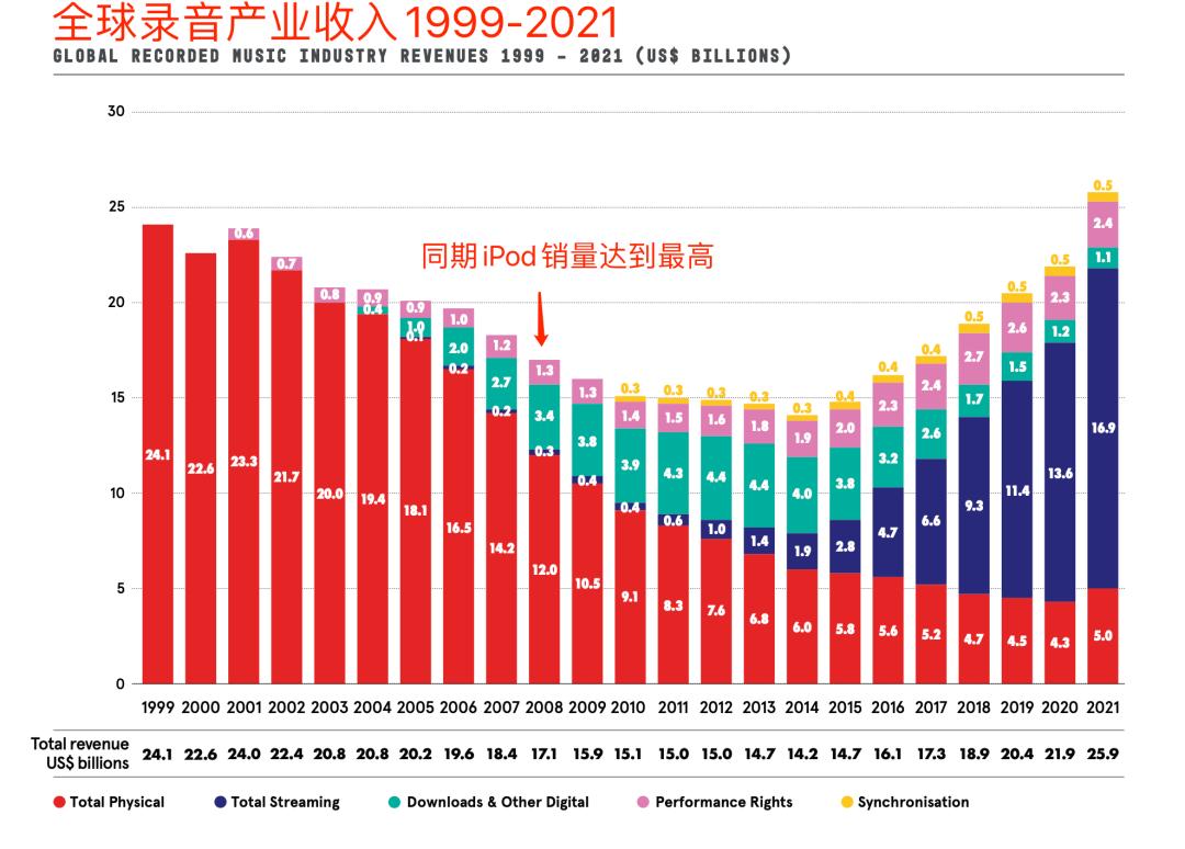 然而,回顾iPod的发展,我们看到的是,苹果的音乐付费下载尽管为音乐产业带来了一些收入,却并没有扭转音乐产业收入不断下滑的局面。2008年,iPod的销量达到历史顶峰,同年,全球音乐产业收入下跌了7%,创历史最大跌幅。