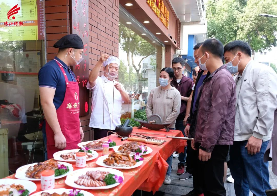 陈海耀(左一)和父亲陈永华给群众介绍广式烧腊制作技艺。