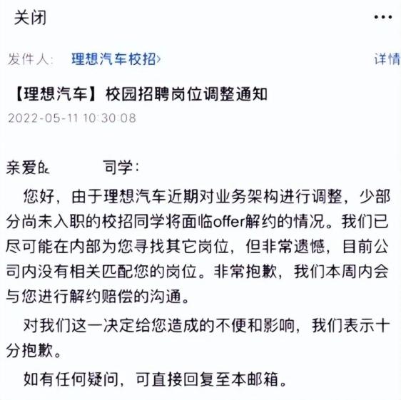 5月11日,有用户在某职场社交软件爆料称,理想汽车在5月“毁约”了一部分2022届校招生。随后,理想汽车官方向媒体确认了这一消息。