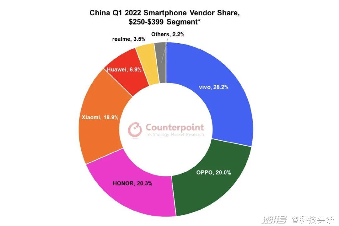 这种感知不仅体现在产品层面,市场层面也给出了非常明确的答案,在Counterpoint刚刚公布的2022年第一季度中国智能手机250-399美元中高端市场报告中,vivo以28.2%的市场份额位居第一,其中vivo S12系列的销量则占了总销量的近12%,高于红米K40、荣耀60、华为Nova9。