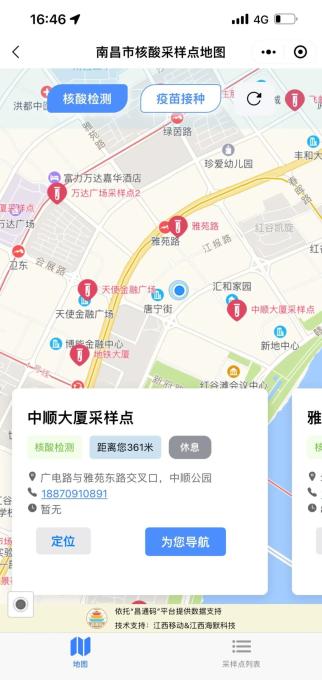 点开核酸地图,就能清晰查看自己附近或者目的地附近的采样点分布情况,通过拖拽、缩放等手动操作,用户还可以在地图上查看南昌其它县区的核酸采样点数量和分布情况。