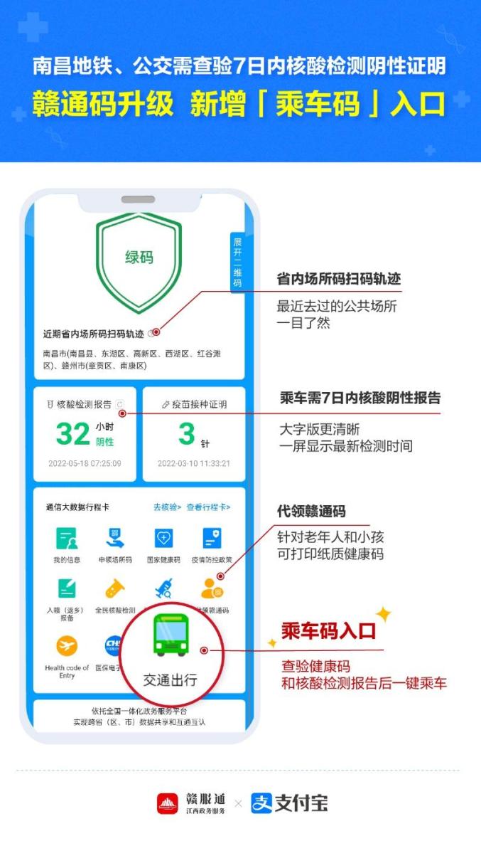今日,南昌轨道交通集团、南昌公交运输集团相继发布最新政策,根据南昌市疫情防控有关要求,自5月20日起,乘坐地铁、公交,对乘车人员查验健康码、行程码和7日内核酸检测阴性证明。市民需积极配合疫情防控工作,接受体温检测,并在乘车过程中全程规范佩戴口罩。