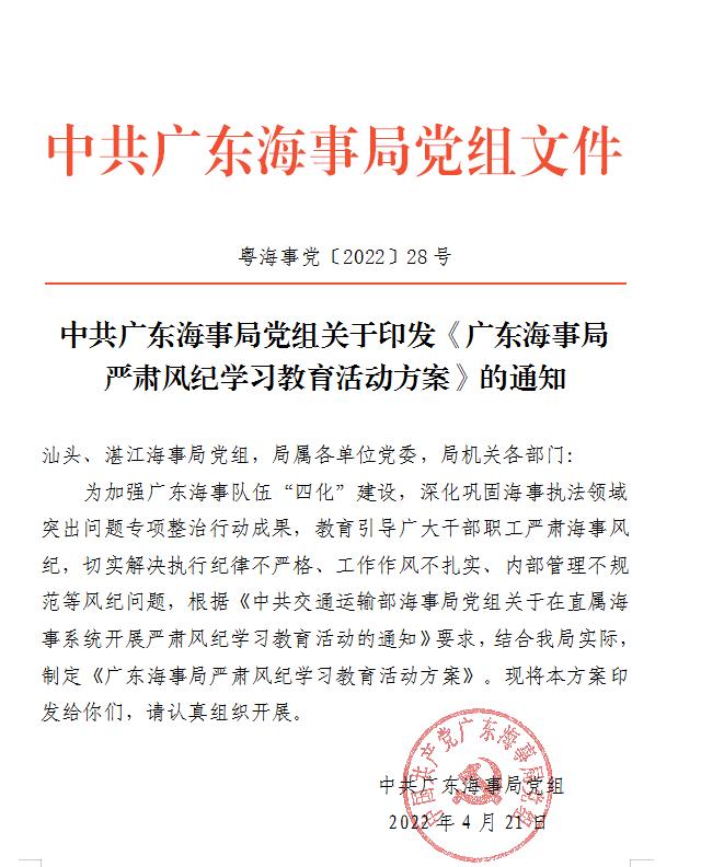 抢前抓早,系统部署到位。自4月18日收到部海事局关于开展严肃风纪学习教育活动通知以来,迅速成立专题督导检查组,局领导亲自谋划工作方案,研究推进举措,把抓好严肃风纪学习教育作为履行党委监督责任的重要内容,并于4月21日制定印发《广东海事局严肃风纪学习教育活动方案》。