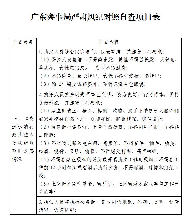 细化指标全面查。对照“两规范”“两禁令”“两规定”,提炼检查清单《交通运输行政执法人员风纪规范》等6方面内容,制定《广东海事局严肃风纪对照自查项目表》,细化55小项工作任务,并要求各单位严格对照指标任务,全面查摆存在问题,形成问题整改清单。