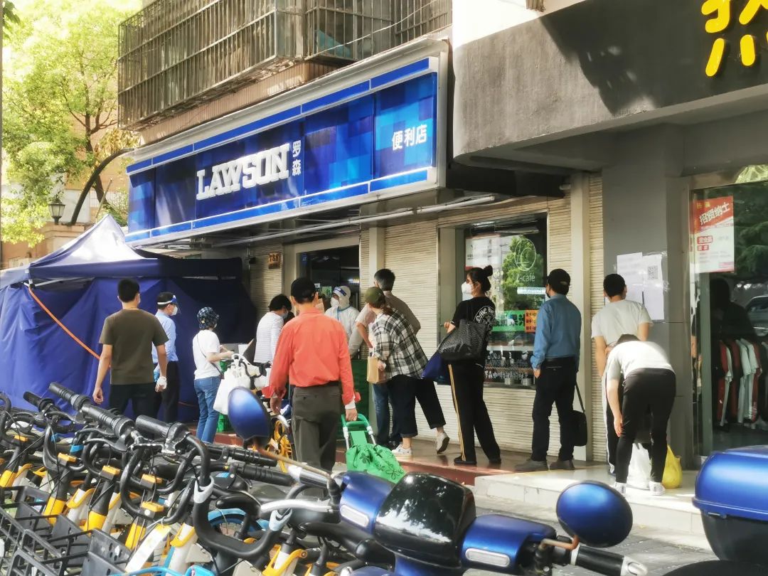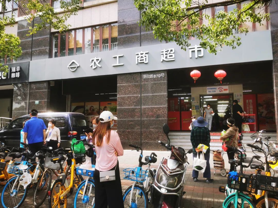 附近的商超门口有不少市民在排队。据说,便利店一次性让三位顾客进入,农工商超市一次进20人;位于百联西郊购物中心内的周边最大的商超世纪联华需要凭邀请卡进入,购物限时45分钟,从购物中心里出来的邻居说超市内商品算齐全,但一定要提前来排队。