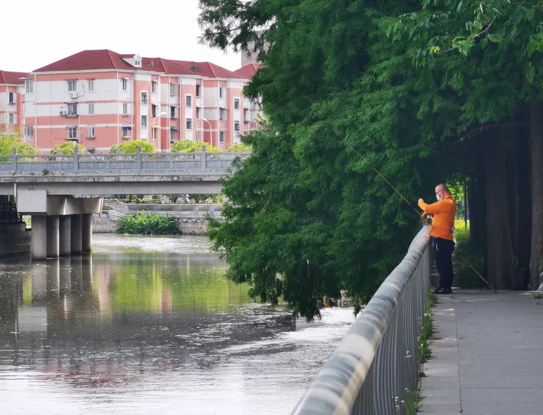 有市民用拍照记录下这特殊的时期,有市民在河边钓鱼。