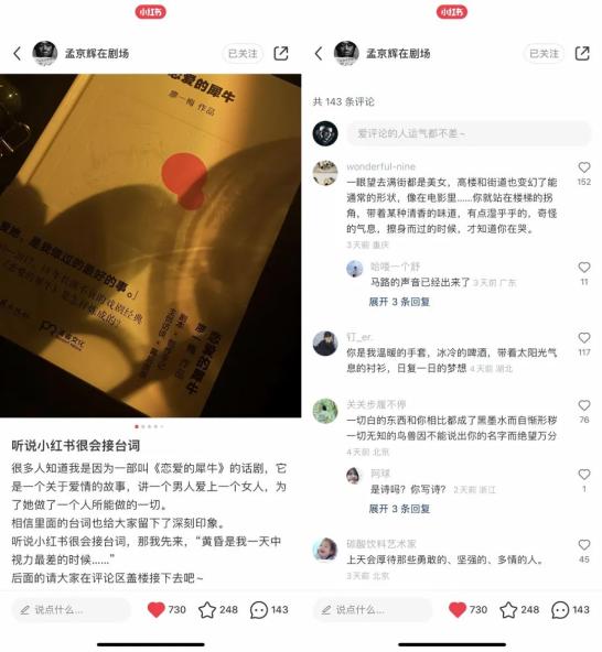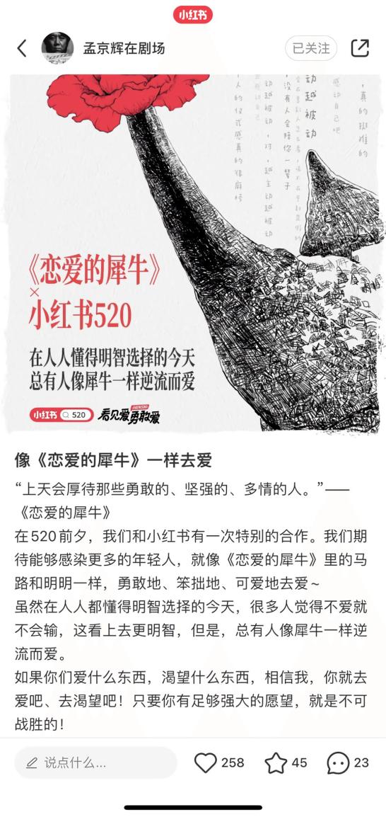 适逢5.20,《恋爱的犀牛》在小红书上又火了。导演孟京辉在小红书上发起《恋爱的犀牛》接台词挑战,尽管已经过了23年,但经典的台词还是留在那些向往爱情的人心中。