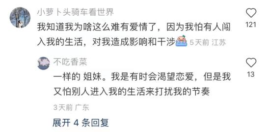 “看过太多失败例子,不相信爱情”、“受过情伤,对恋爱有阴影”、“谈恋爱需要花费精力,很麻烦”。