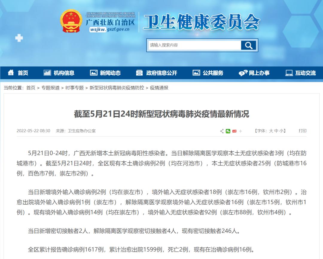 5月21日0-24时,广西无新增本土新冠病毒阳性感染者。当日解除隔离医学观察本土无症状感染者3例(均在防城港市)。截至5月21日24时,全区现有本土确诊病例2例(均在河池市),本土无症状感染者25例(防城港市16例,百色市7例,崇左市2例)。
