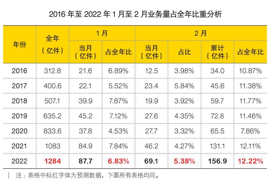 如按国家邮政局公布的1月至2月19.6%的行业累计业务量增幅,全年为1295亿件,1月至2月累计131.1亿件占比为12.11%,与全年增幅29.9%的2021年相同,远高于2016年至2021年均值10.9%。由此可见,1月至2月,中国快递行业极其景气。即使考虑疫情因素,降低1个百分点至18.6%的业务量增幅,测算全年1284亿件,则1月至2月占比12.22%,远高于此前6年。