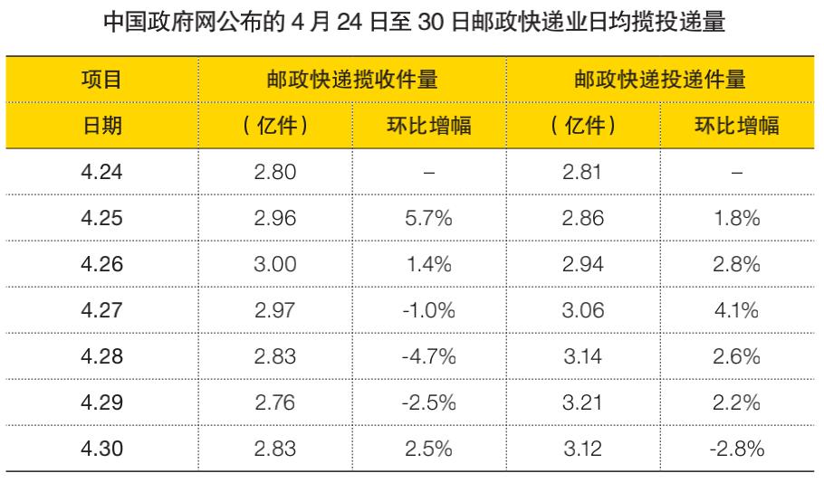同时,4月疫情影响逐步缩小。按中国政府网公布的数据,4月24日至30日行业日均揽收量为2.88亿件,按国家邮政局公布的4月74.8亿件的业务量,测算4月1日至23日日均揽收量为2.38亿件。由此可见,在4月初行业运营持续大幅减缓情况下,月底已在逐步恢复。