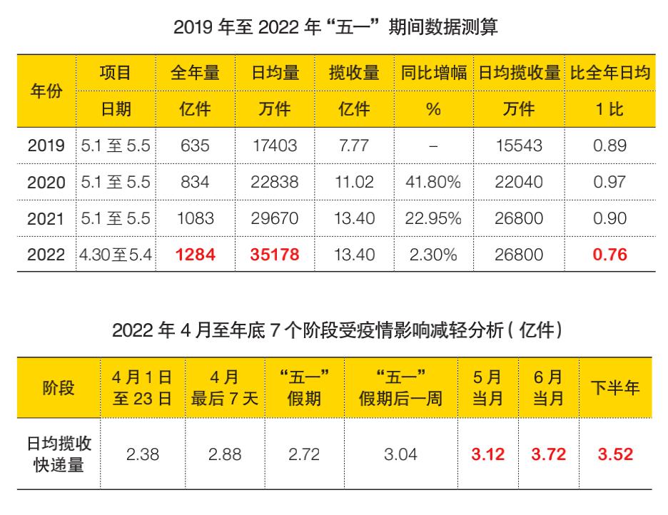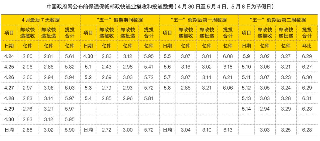 进入5月,按中国政府网公布的数据,受疫情影响的4月最后7天(含1天假期),日均揽收量为2.88亿件,揽投合计5.90亿件;疫情影响减小但受假期因素影响的“五一”期间,日均揽收量为2.72亿件,揽投合计5.72亿件;而“五一”后4天(含1天周末)5月5日至8日日均揽收量3.05亿件,揽投合计6.13亿件;“五一”假期后第二周5月9日至14日(含1天周末)日均揽收量3.04亿件,揽投合计6.28亿件,远高于4月最后同样包括1天假期的7天的2.88亿件和5.90亿件,再对比4月1日至23日的日均揽收量2.38亿件,足见疫情影响逐渐减小。
