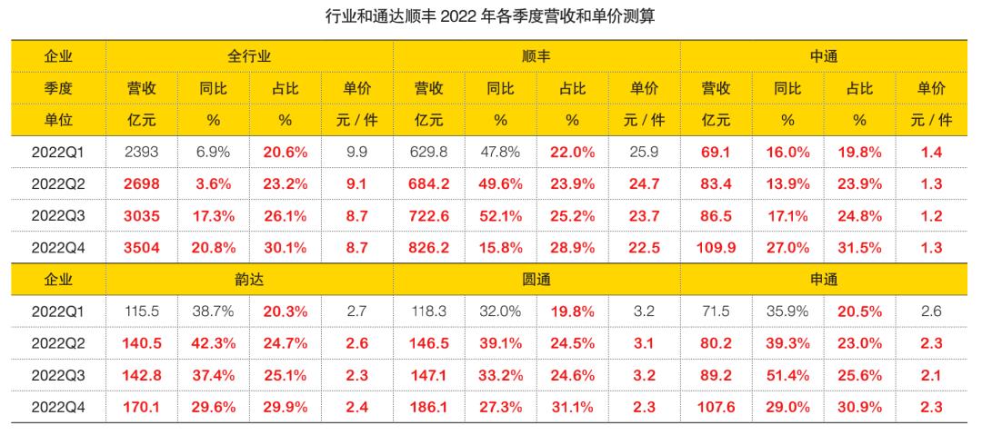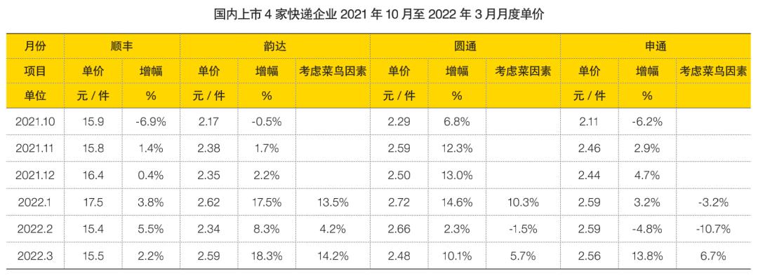 结合一季度数据,对二、三、四季度数据进行测算,总体来看,各家企业平稳发展,件均单价稳中有降低。