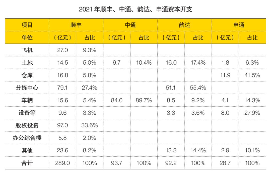 2021年顺丰、中通、韵达、圆通、申通资本开支现金分别为192亿元、93.3亿元、82.5亿元、55.6亿元及28.7亿元,同比分别增长56.5%、1.3%、37.3%、6.6%、19.8%,其中中通、圆通资本开支速度显著放缓。从具体投资方向来看,土地及分拣中心依然为重点投向。顺丰2021年分拣中心投入79.1亿元,比2020年投入增长超过1倍,占比为27.4%。韵达分拣中心投入51.1亿元,占比为55.4%。申通投入11.9 亿元,占比为41.5%。顺丰、中通、韵达及申通在土地储备方面分别投入14.5亿元、9.7亿元、16亿元、1.8亿元,占比分别为5.0%、10.4%、17.4%、6.3%。