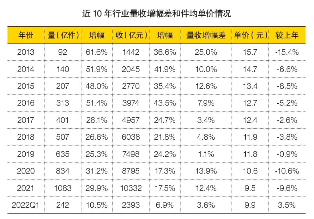 从单价角度看,历年一季度单价均高于其他季度,尤其受疫情影响很重和价格战烈度最高的2020年一季度比四季度高2.3元/件。综合2022年形势判断,受疫情影响,行业件均单价降低幅度较小,因此总体判断,在一季度9.88元/件基础上,全年单价9.06元/件。
