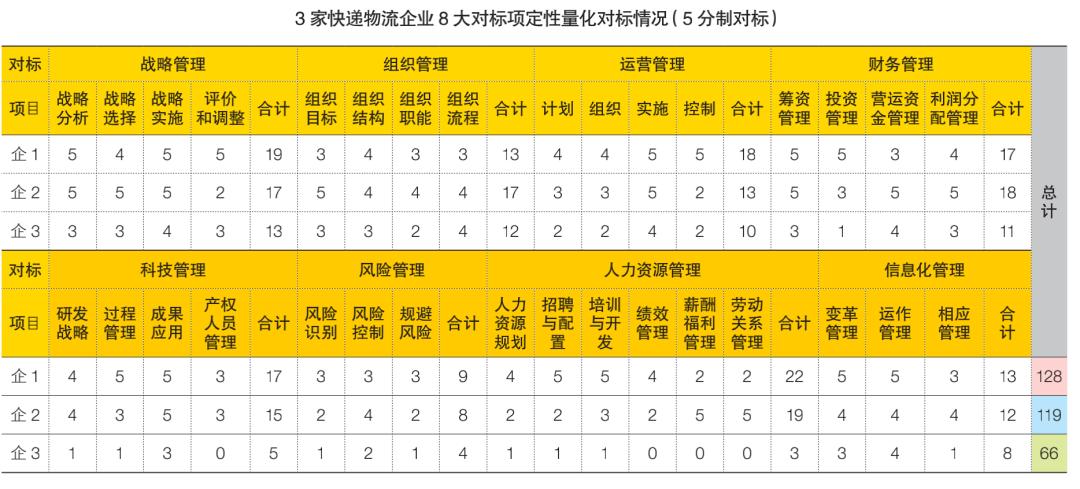 对邮政快递企业而言,行业规律、市场规律和价值规律并不复杂,按规律发展、稳定不要冒进、少犯错误,符合规律发展的企业将是高质量发展的企业。对3家快递物流企业的8个方面的管理进行定性评价,而后给予量化对标,可明确企业尚有缺项,需要进行补短板、强弱项。