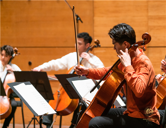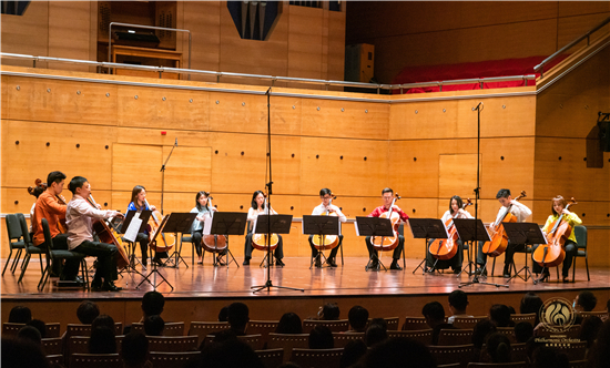 如果说在这趟音乐之旅中,爵士代表了北美独树一帜的艺术性格,那南美大陆则拥有由探戈引领的自由内核。先是阿根廷作曲家皮亚佐拉的《神秘与赋格》和《别了诺尼娜》,在探戈的灵魂旋律里融合了古典乐的严谨和爵士乐的即兴,充满魔幻的艺术哲思。接着是巴西作曲家维拉•罗伯斯的《巴赫风格的巴西颂》第五首。该作品系列的第一首和第五首是专门为大提琴而创作,杭爱大提琴声部曾演绎过第一首,此次旅美女高音歌唱家张婉哲的加入正好成全了第五首的精彩演绎。被西方媒体评价为“来自东方的百灵”的张婉哲是美国波士顿中国音乐家协会会长,一直坚持在海外宣扬中国文化、传播中国音乐。当晚,张婉哲清亮柔美的女高音和十三把低沉抒情的大提琴相互配合,犹如朝阳喷薄于碧波之上,充满了高亢向上的立体平衡之美。