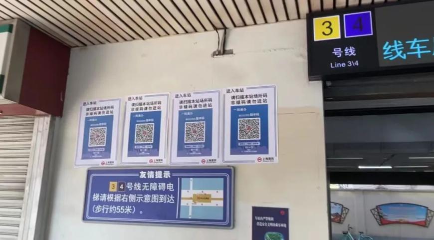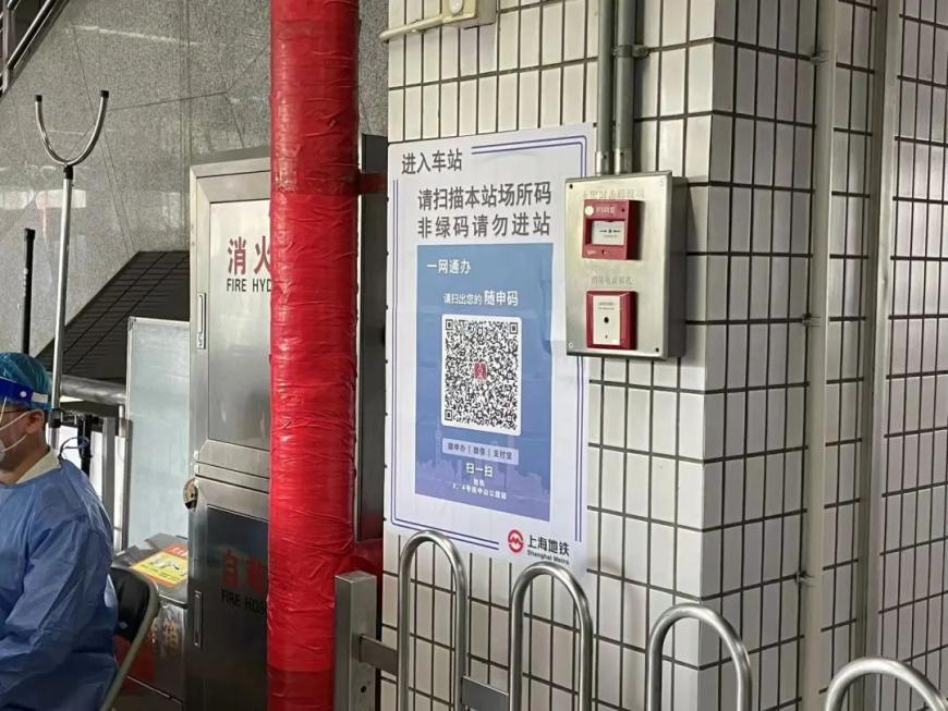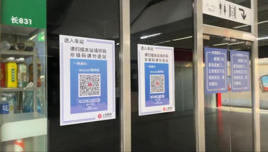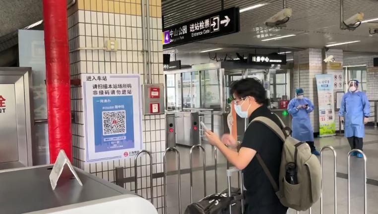 早上七点,记者赵宏辉在中山公园站看到,站外墙壁上张贴了多张“场所码”,车站广播语音提示“进入车站前请扫描本站场所码,非绿码乘客请勿进站”。