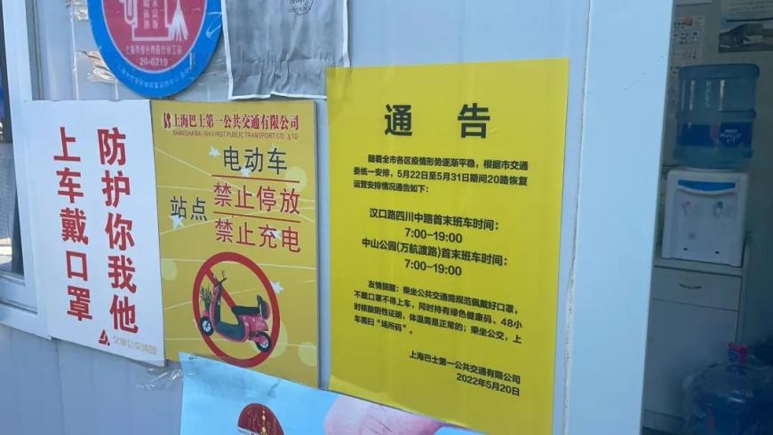 早上6点半,记者周依宁来到位于中山公园万航渡路的20路公交车起点站。能看到调度室外面贴上了通告,“5月22日至5月31日期间,汉口路四川中路首末班车时间7:00-19:00;中山公园(万航渡路)首末班车时间7:00-19:00”。