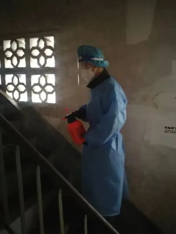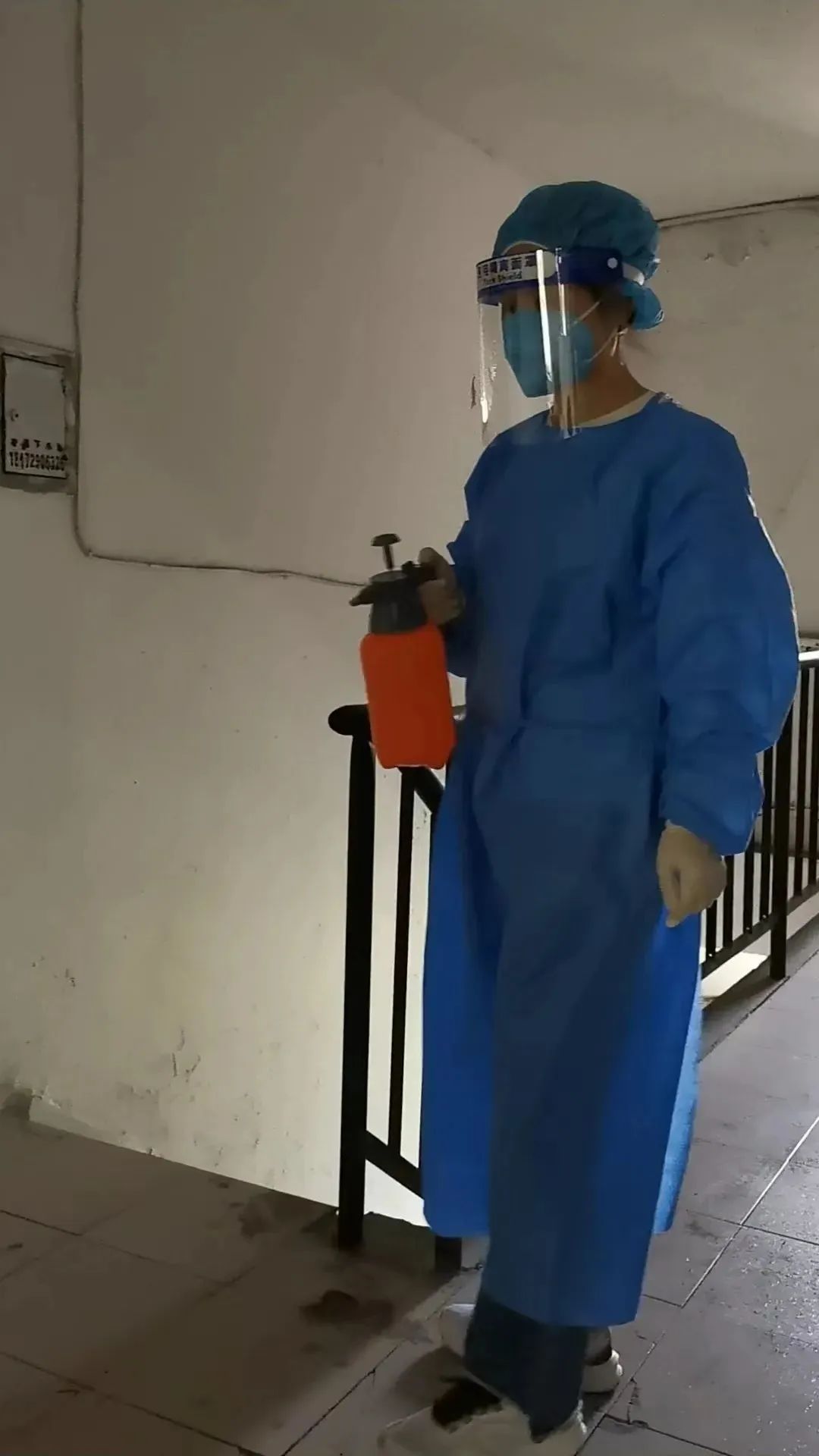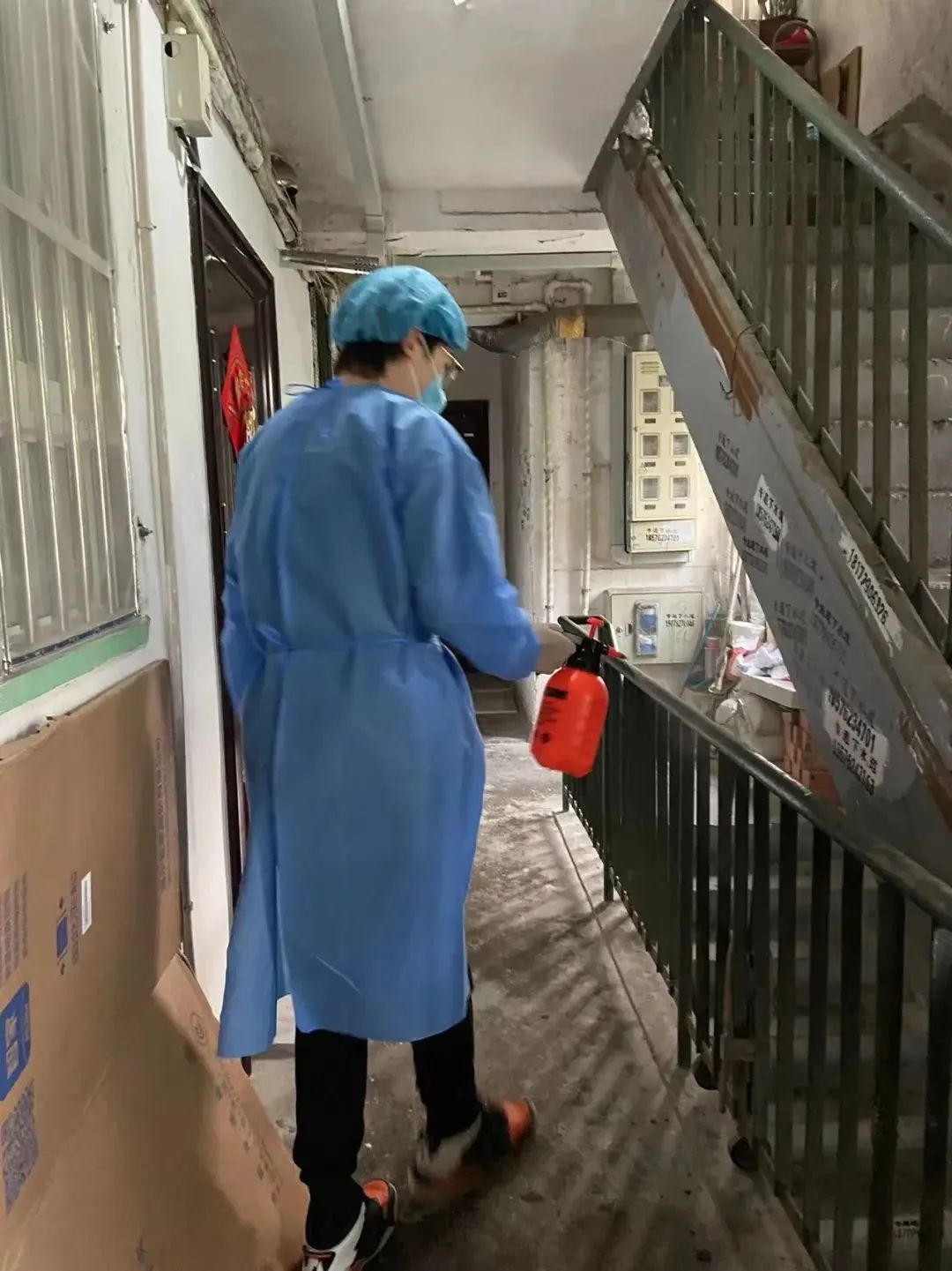 做好防护措施,戴好N95口罩,按比例配备好消毒药水,志愿者们拿起喷壶,开始了一天一次的楼道消杀工作。