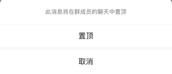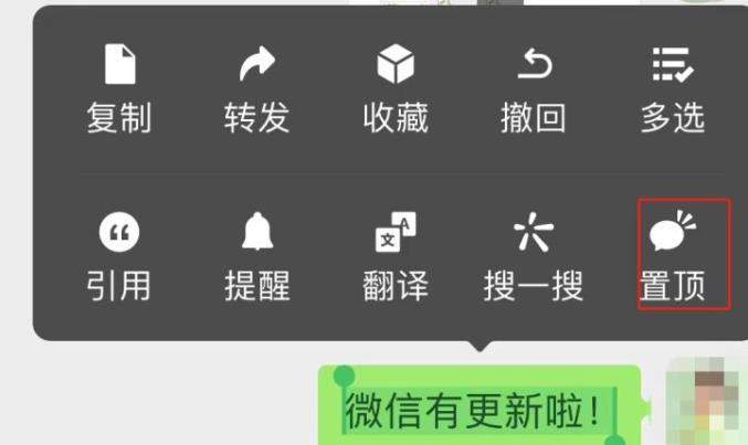 当群主或管理员在微信群中长按消息时会弹出功能菜单栏其中新增了「置顶」功能选项。