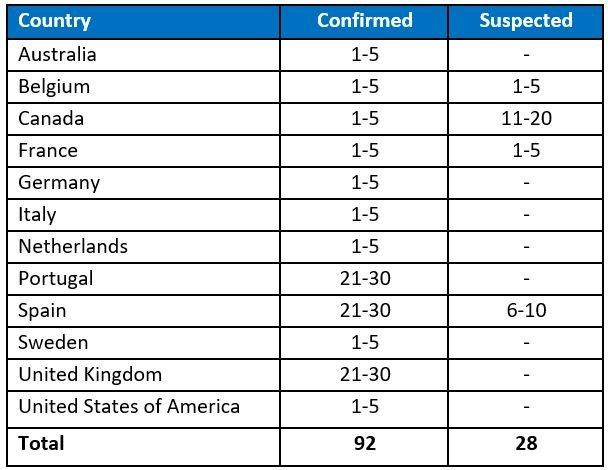图片说明:2022年5月13日至21日13:00期间,非猴痘病毒流行国向世界卫生组织报告的确诊和疑似病例统计。/WHO