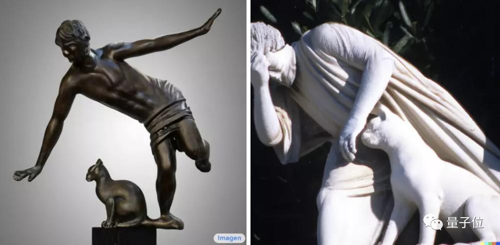 直接上图对比,左边是谷歌Imagen选手眼中的“猫猫绊倒人类雕像”,右边则是DALL·E 2选手的同题创作。
