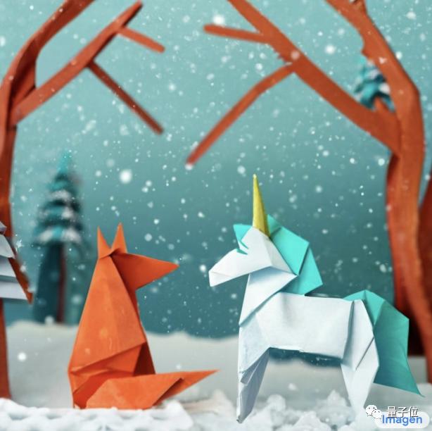 输入“折纸作品:一只狐狸和一只独角兽在飘雪的森林里”,Imagen创作出的画面则是酱婶的: